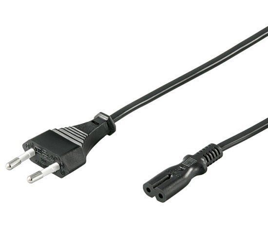 Napájecí kabel v černém provedení pro napájecí adaptér. Dvoužilový kabel je zakončený koncem v podobě ležaté osmičky.- První konektor: Euro male (Type C CEE 7/16)