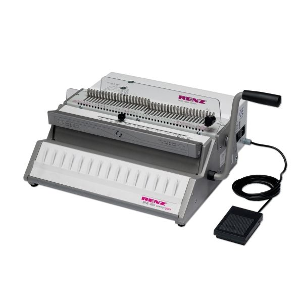 Elektrický stolní děrovač a vázací stroj do RENZ RING WIRE® pro výrobu všech typů brožur a kalendářů. Vyrobeno pro použití v tiskárnách a copyshopech pro střední zatížení.Comfortplus znamená výrazné zvýšení rychlosti děrování ve srovnání s původní comfort sérií. Vyšší rychlosti se dosahuje použitím nového motoru, který je dvakrát tak silný.Sváže najednou až 135 listůPřesné nastavení zavíracího systému zaručuje perfektní výsledek za každých okolnostíSpeciání tvrzené děrovací segmenty s patentovaným tvarem pro kvalitní průraznost a životnostQSA (Quick Size Adjustment) pro vysokou flexibilitu při změně formátů papíru: A5, A4 a A3Nastavitelný boční doraz pro přesné vedení papíruSnadno otevíratelný zásobník na papírové konfetyMěřítko pro určení velikosti drátěného hřbetuRobustní konstrukce & kompaktní designPočet proděravěných listů za hodinu 16000Nastavení hloubky dorazuDělení 3:1 Vyřaditelné nože - ano (všechny)Specifikace:
