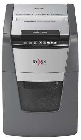 Rexel Optimum AutoFeed 90X automatická skartovačka papíru s křížovým řezemSkartovačka Optimum AutoFeed 90X automaticky skartuje až 90 listů papíru A4 (80 g /m2) křížovým řezem P-4 (4 x 28 mm). Tato skartovačka s automatickým podáváním je sofistikovaný kancelářský skartovač s výsuvným košem o objemu 34L. Není třeba ručně podávat papír nebo nejdříve odstraňovat svorky a kancelářské sponky, tento automatický skartovač papíru udělá vše za vás.