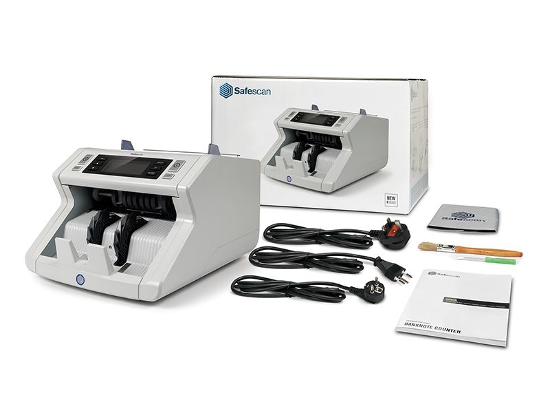 V balení: Safescan 2250, manuál, čistící a servisní sada, napájecí kabely (EUR/UK/Švýcarsko), kryt proti prachu