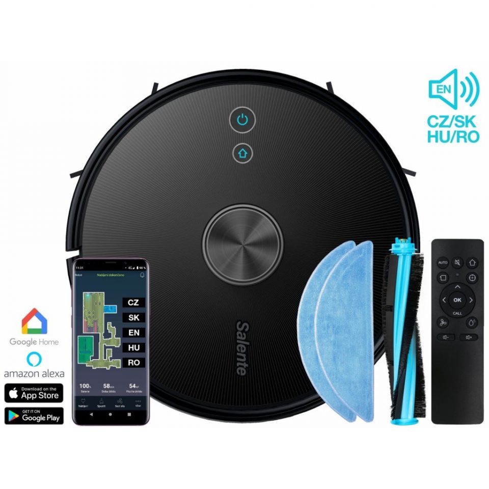 SALENTE L6, laserový robotický vysavač (stírání vodou a nabíjecí stanice)360° laserová navigace při úklidu, mluví česky, mobilní aplikace v češtině, vysává a vytírá současně, přizpůsobení povrchu podlahy, automatické pokračování v úklidu, kombinovaná nádoba na vodu a prach, plánovaný úklid, zónový úklid, TOF senzor, virtuální zeď