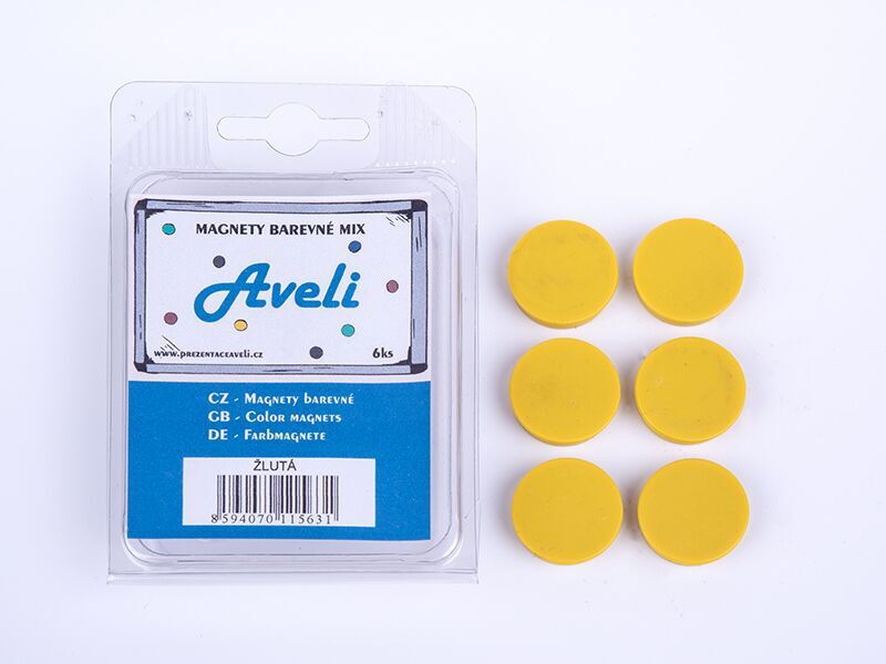 "Magnety pro tabule Aveli v barevných rozlišeních.Balení 6 kusů magnetů v žluté barvě."
