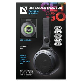 Přenosný reproduktor Defender ENJOY 20ENJOY 20 přináší překvapivě hlasitý a vyvážený zvuk prakticky bez zkreslení díky nejnovějšímu standardu Bluetooth 5.3 uzavřenému v malém praktickém pouzdře.