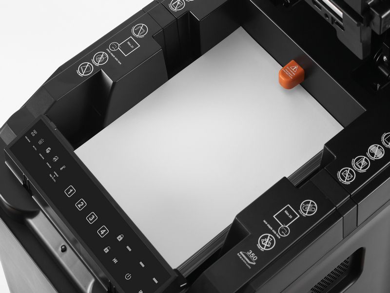 Skartovací stroj AT-350AF Skartovací stroj AT-350AF AT-350AF je skartovací stroj s automatickým podavačem v elegantním dvoubarevném provedení. Stroj je vybaven příčným řezem o velikosti 2 x 12 mm. Objem zásobníku má poctivých 350 listů papíru A4 (70g/m2). Maximální doba nepřetržité skartace je 240 minut. Odpadní nádoba má objem 53 litrů. AT-350AF je vybavena výsuvným košem pro snazší manipulaci. Zapnutí nebo přehřátí přístroje indikuje LED kontrolka. Stupeň utajení DIN P5 Vysoké zabezpečení skartovaných dokumentů zajišťuje stupeň utajení DIN P5 dle evropské normy DIN 66399. Ke stroji je vyhotoven certifikát NBÚ NNI 2–důvěrné. Uzamykatelná schránka podavače zaručuje nečitelnost i pro ještě neskartované dokumenty. Invertní motor Skartovací stroj AT-180AF je osazen novým invertním motorem, který má několik předností: Tichý chod (hluk motoru pod 51 dB – při skartaci je slyšitelné pouze rozřezávání papíru) a stabilní výkon. Oproti předchozí generaci DC motorů nedochází k opotřebení magnetů a cívky, a výkon se nesnižuje ani po několika letech. Výkonná a vytrvalá Skartovací stroj AT-350AF je mimořádně tichý stroj (51 dB) s automatickým podavačem papíru. Snese i papíry sešité kancelářskou sponkou (pokud je umístěna v rohu papíru). Systém AutoFeed ušetří spoustu času – stačí vložit papíry, zavřít víko a odejít. Skartovač je zpracuje automaticky. Skartovací cyklus AT-350AF dovoluje nepřetržitou skartaci až 240 minut. Jednoduché ovládání Ovládání skartovačky je snadné a praktické – probíhá pomocí dotykového displeje. LED kontrolky informují o plném koši, zaseknutém papíru, přehřátí, vysunutém koši a zapnutém stavu stroje. Zásobník papíru pro 350 listů Skartovač pracuje samostatně a zpracuje celý zásobník. Nový podávací mechanismus zvládne i zaprášené nebo sponkami sešité papíry. Expres skartace až 11 listů Během skartace ze zásobníku je možné vložit až 11 listů papíru nebo kreditní kartu do separovaného vstupu. Koš s kapacitou 53 litrů Odpadní nádoba je výsuvná pro snadnou manipulaci. Průhledné okénko umožňuje optickou kontrolu naplnění. Klíčové vlastnosti skartovače AT-350AF AT-350AF skartuje pomocí zásobníku až 400 listů (70 g/m2) papíru Zvládne skartovat plastové karty Automatické zapnutí/vypnutí, funkce zpětného chodu při zaseknutí Maximální doba provozu: 240 minut Skartuje sponky, plastové karty i CD LED kontrolky: zapnutí, přehřátí, zaseknutí, otevřený koš Stupeň utajení: P-5 53 litrový koš s průhledným okénkem Pojezdová kolečka pro snadnou manipulaci Šířka vstupu: 240 mmDotaz na produkt