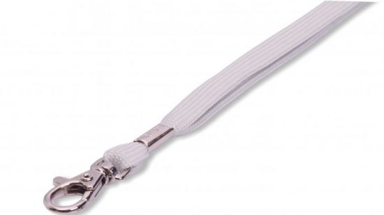 Šňůrka na krk s karabinou pro uchycení visačky. Lze použít na visačku s vyděrovaným otvorem, se závěsem nebo vhodným očkem. Dutá šňůrka šířky 12 mm, délky 900 mm (2x450 mm). Velikost karabiny: výška 35 mm, šířka 14 mm.Specifikace: