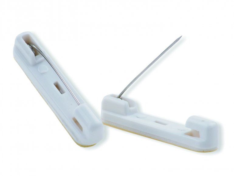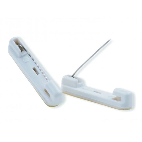Plastový špendlík se samolepící zadní stranou, rozměry: 35 x 7 mm. Kombinace bílý plast + spínací špendlík chromovaný kov. Slouží pro nalepení na zadní stranu jmenovky a následné uchycení jmenovky na oděv.Specifikace: