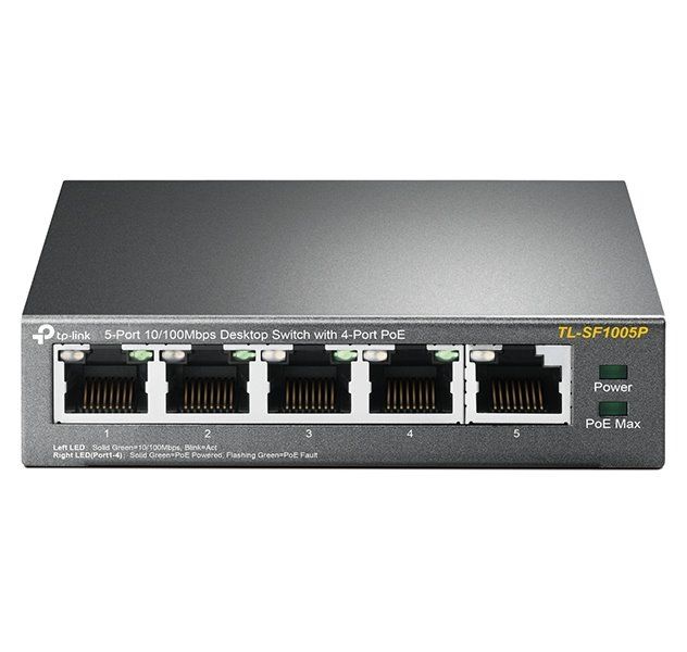• 5× 10/100 Mbps RJ45 Ports (4× 10/100 Mbps 802.3af/at PoE+ ports)