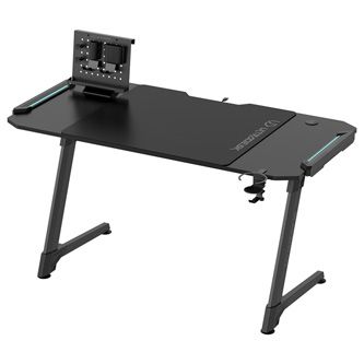Pohled do budoucnosti?Společnost Ultradesk přínáší tento Sci-fi herní XXL stůl, který přípomíná ovládací panel vesmírné lodi. Speciální kryty, které se nacházejí na pracovní ploše, vytvářejí unikátní design a pomocí nádherného RGB podsvícení padnou do oka každého hráče. Pro tento model byly použity rámy ve tvaru Z, aby stůl ještě více připomínal cockpit vesmírné lodi. Stačí pouze vypnout světla v místnosti a užívat si výpravy do budoucnosti. Nekonečná ukládací plocha potěší všechny ty, kteří chtějí mít svoje gaming doplňky vždy po ruce.