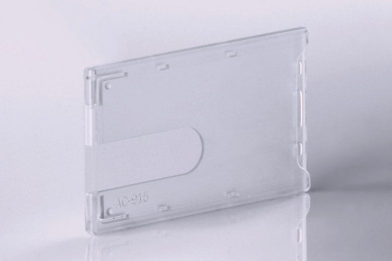 Tuhá plastová visačka pro magnetické karty - svislá, provedení z průhledného polomatného plastu. Výhodou visačky je výsek pro snadné čtení kódu, má zaoblené hrany. Možno zavěsit na klips se šlí (v našem sortimentu klips Americký, nebo klips Evropský), šňůrku nebo naviják. Oválný výsek pro zavěšení 15x3 mm + dva kulaté výseky. Vnější velikost: výška 95 mm x šířka 55 mm x hloubka 4 mm.Specifikace: